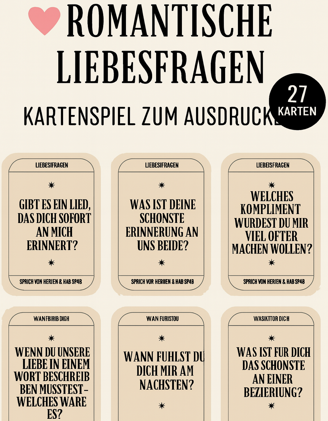 Manchmal sind es die kleinen Fragen, die uns einander wieder ganz nah bringen. Dieses Kartenspiel romantische Liebesfragen lädt euch zum Lachen, Schmunzeln und Nachdenken ein – perfekt für einen gemütlichen Abend zu zweit. Egal ob frisch verliebt oder schon lange zusammen: Mit diesen Fragen entdeckt ihr euch immer wieder neu.